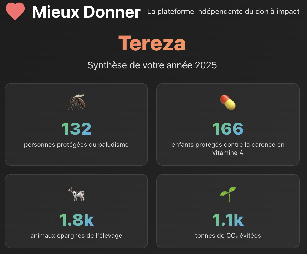 🇫🇷 France / 🇨🇭 Switzerland: You can donate to Against Malaria Foundation directly via the fundraiser page that you are on right now! In France, it is 66% tax-deductible, so you can essentially triple your impact for the same out-of-pocket cost. The donations go via Mieux Donner, which is what I use for my personal donations. You can see some of the impact of my 2025 personal donations in the image below, it’s quite impressive even for donations that feel very manageable to my budget! It is a very simple process and you get two-thirds of your donation back at the end of the tax year as a FR fiscal resident. You can learn more about how to get the tax refund to triple your donations here, and I am happy to help explain it too.