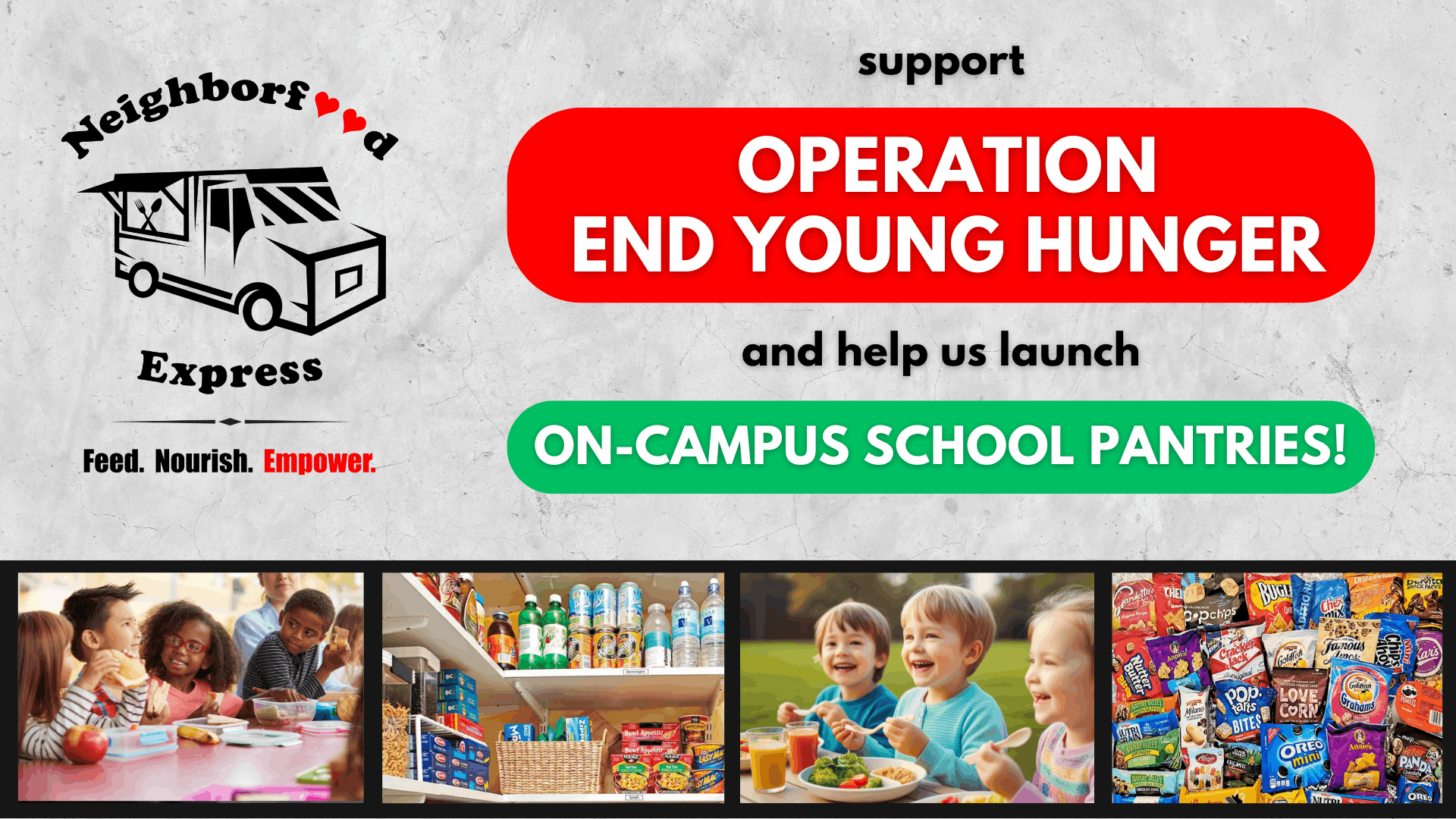To combat this problem at its roots, we're expanding Neighborfood Express by creating food & resource pantries on the campuses of local schools! For this reason, we’ve launched Operation End Young Hunger, which will provide us with the funding we need to stock the pantries with the same items we provide for the families we serve each week: