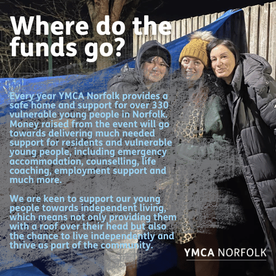 You can can sign up below, alongside paying a small registration fee, which helps towards covering costs, You’ll then be sent a participant pack which includes information on how to fundraise for the event and what to bring with you on the night! If you would like any further information in the meantime, please email our Marketing and fundraising officer, Elsie, on elsie.yiasimi@ymcanorfolk.org