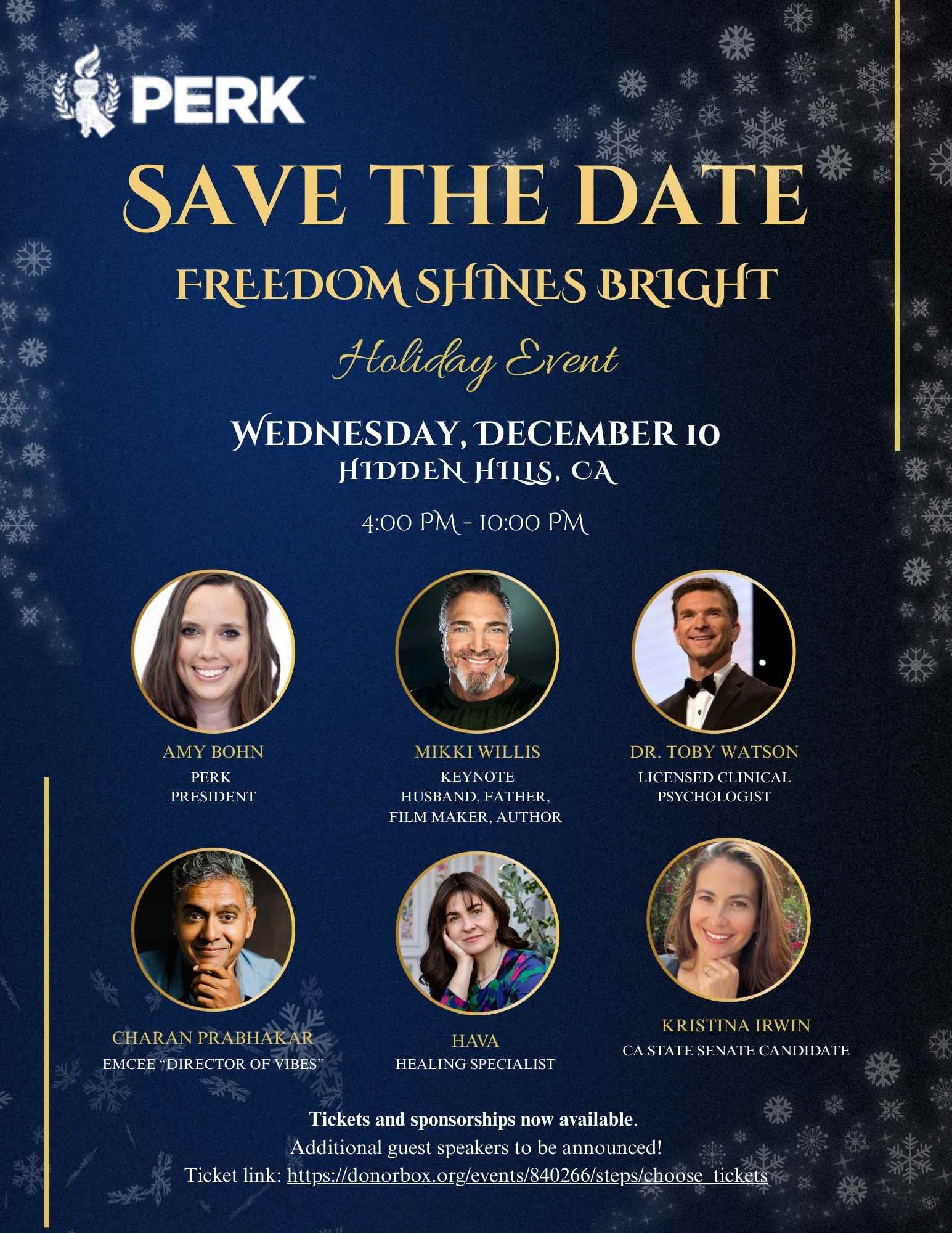 Join us for an inspiring evening featuring dynamic guest speakers—including a nationally recognized leader on critical issues affecting parents and children. Be empowered with knowledge, gain insights from experts and local and national leaders, celebrate PERK’s victories in 2025, a 5 year recap, and get a first look at the exciting new programs launching in the New Year. Guest speakers include Dr. Toby Watson, Senate Candidate Kristina Irwin, Charan Prabhakar, Hava the healing specialist, and more…