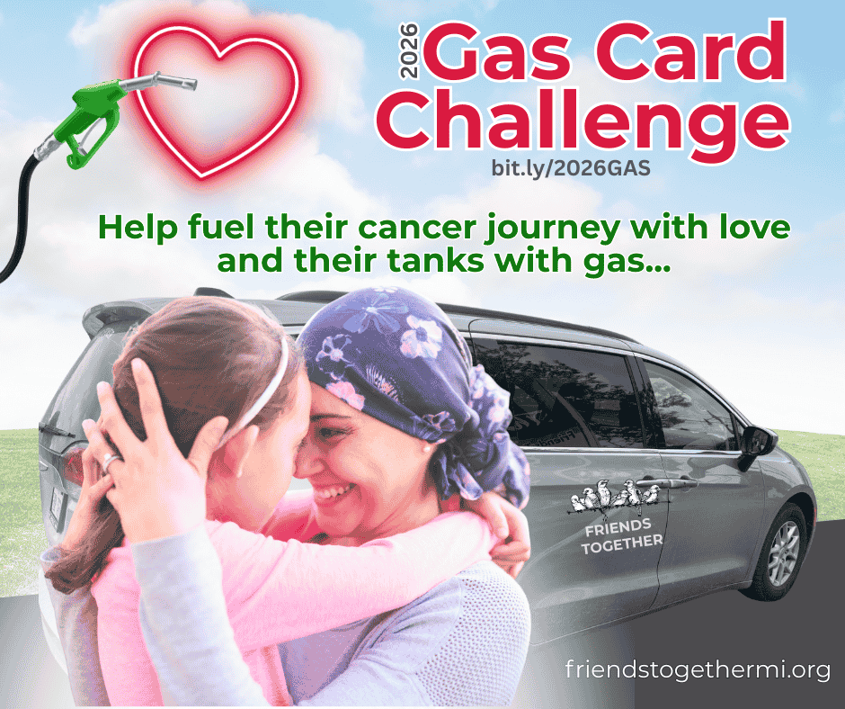Friends Together is a nonprofit cancer support organization with the mission of helping people impacted by cancer. Our vision is a community where no one faces cancer alone. Our annual Gas Card Challenge is kicking off March 1, 2026 and will run through April 30, 2026 with the goal of collecting funds to help offset the costs of medical related transportation for our northeastern MI "friends". Whether it is travel to downstate specialist or hospital or five-day a week treatment at our regional cancer center, the cost of travel for patients can really add up. Each month, Friends Together distributes on average $5,000 in gas cards to help with transportation to cancer related care. Your donation (BIG or small) will go a long way toward helping fuel their cancer journey with love and their tanks with gas. We gladly accept online donations, but you can also drop off gas cards from any brand in any denomination or send donations by mail to: