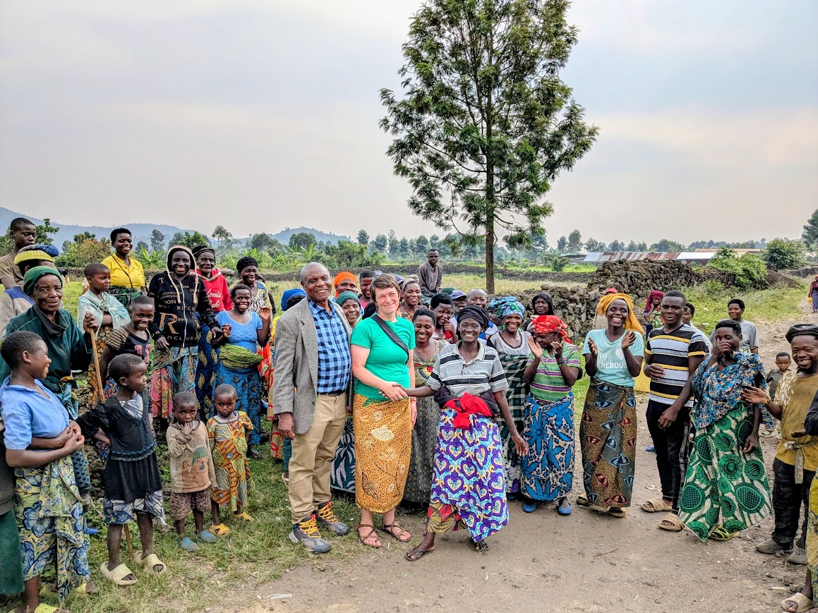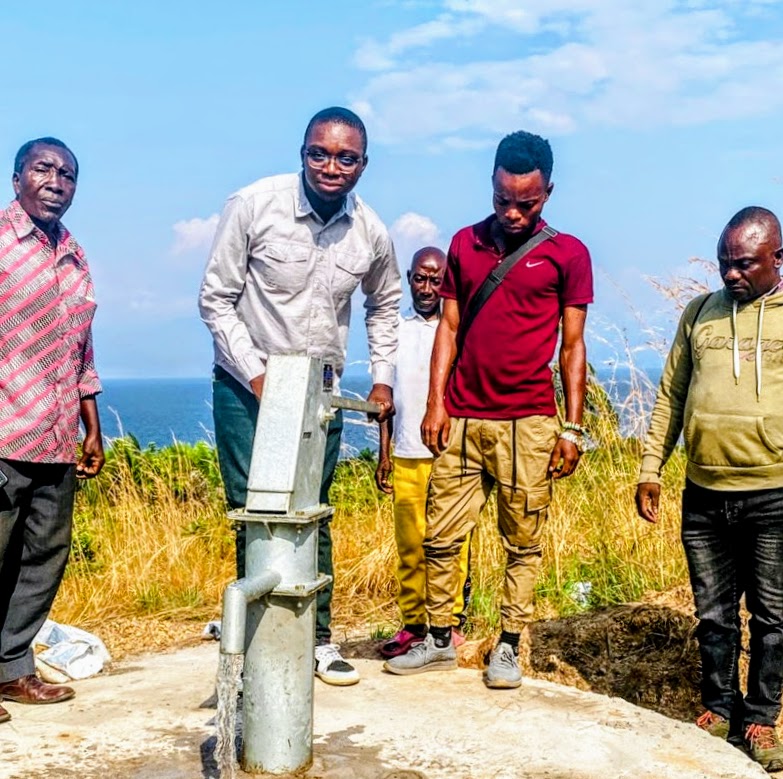 Testing out a GFI-funded well in the Democratic Republic of Congo, with Lake Tanganyika in the background.