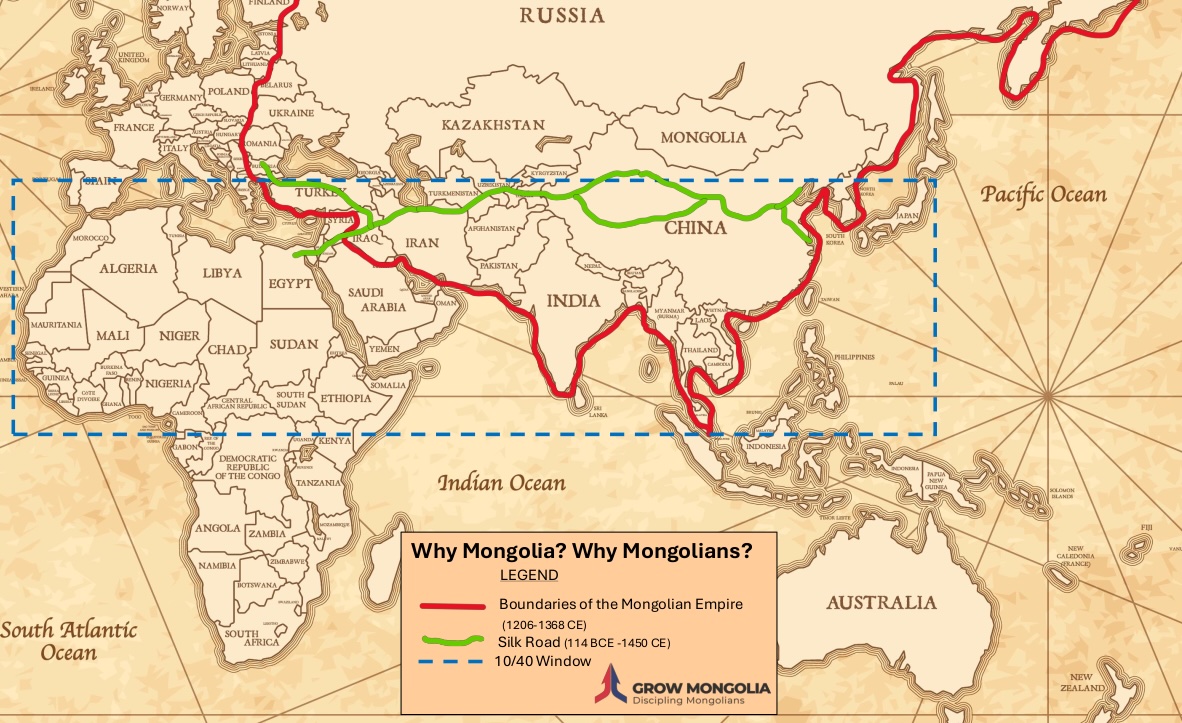 The ancient Silk Road that connected Europe, Asia, and the Middle East for over 1,500 years enabled East–West trade and was also a corridor for religious, philosophical, and scientific thought. During the era of the Mongolian Empire, travelers along the Silk Road enjoyed increased security and ease of movement for unrestricted trade thanks to relative peace across Central Asia, military protection by Mongolian troops, and expanded trade partnerships from countries in the Mediterranean basin to Eastern China. European missionaries and papal envoys also traveled this route to introduce Christian doctrine, confer with Mongol leaders, and seek to convert believers to Christianity. Today, the Mongolian people group, our focus at Grow Mongolia Ministry, is strategically placed and holds great potential to facilitate another Gospel movement along the Silk Road in this generation. - The 10/40 Window*: