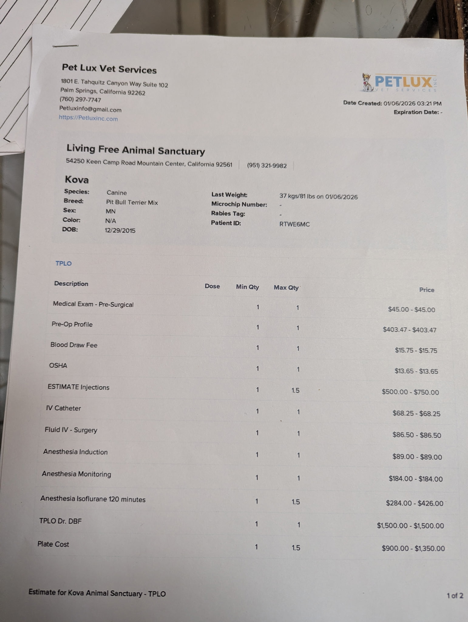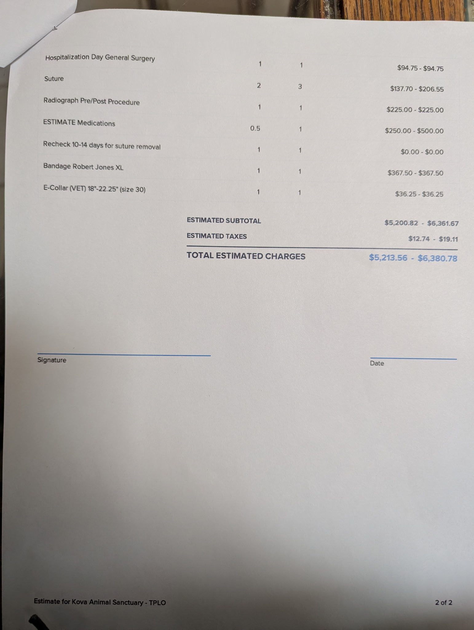 Below is the estimate for Kova's surgery: