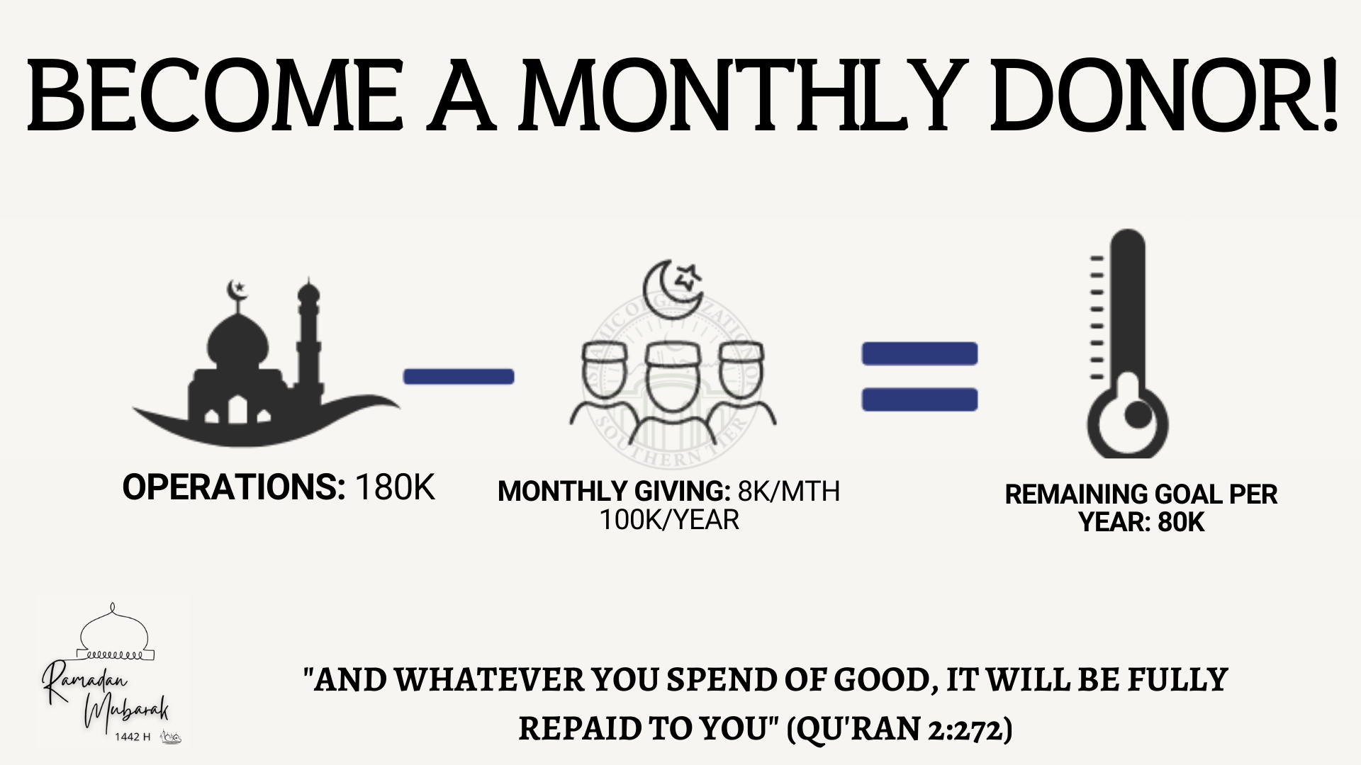 We want to take this opportunity to thank all of you for supporting the masjid over the years. Indeed, we could not have done it without you. May Allah SWT reward each and every person who has helped us in keeping the masjid operational and, in turn, enabled us to support our growing community! While we our masjid is open now alhamdulillah, and we are almost back to resuming normal function at the masjid, our operational expenses still continue, and have gone up during COVID-19. In past years, we collected almost 80% of the masjid’s budget during the blessed month of Ramadan