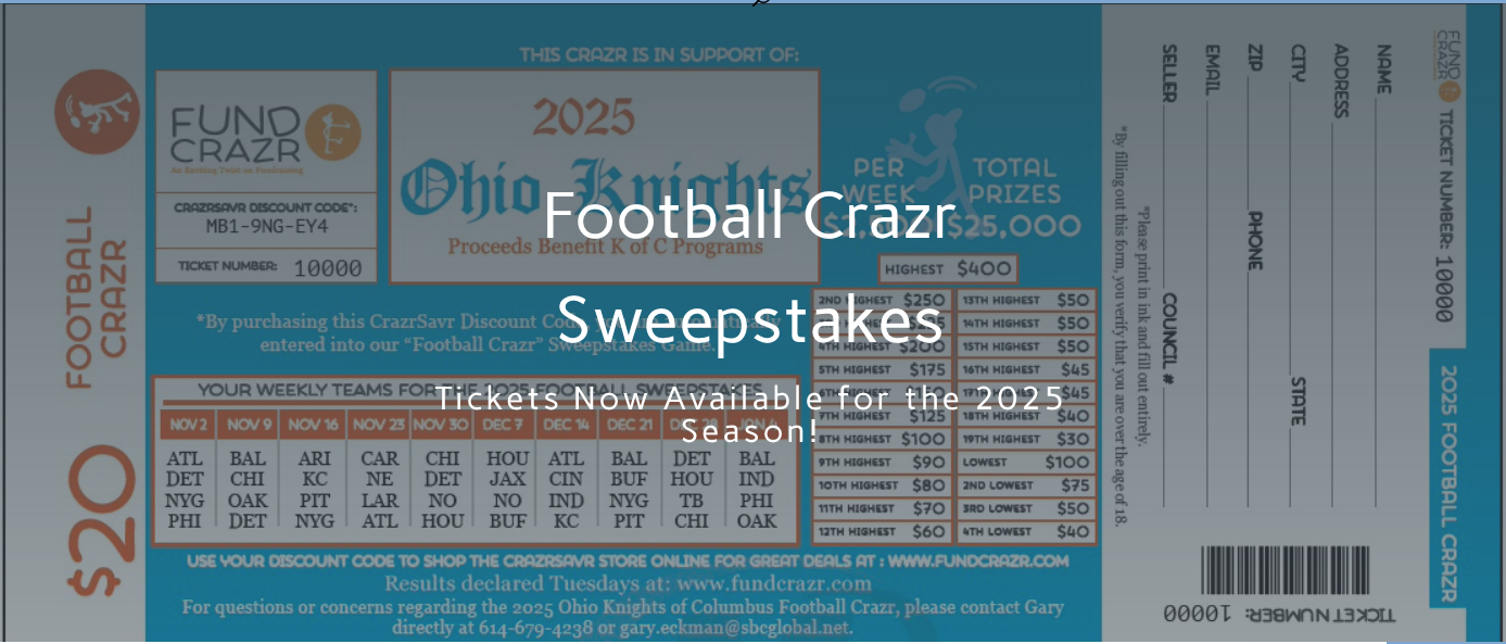 The scores from the previous week’s games are used for teams that are not scheduled to play on any given week. A winners’ list will be posted on www.fundcrazr.com and www.kofcohio.org – Password is going to be your ticket number.