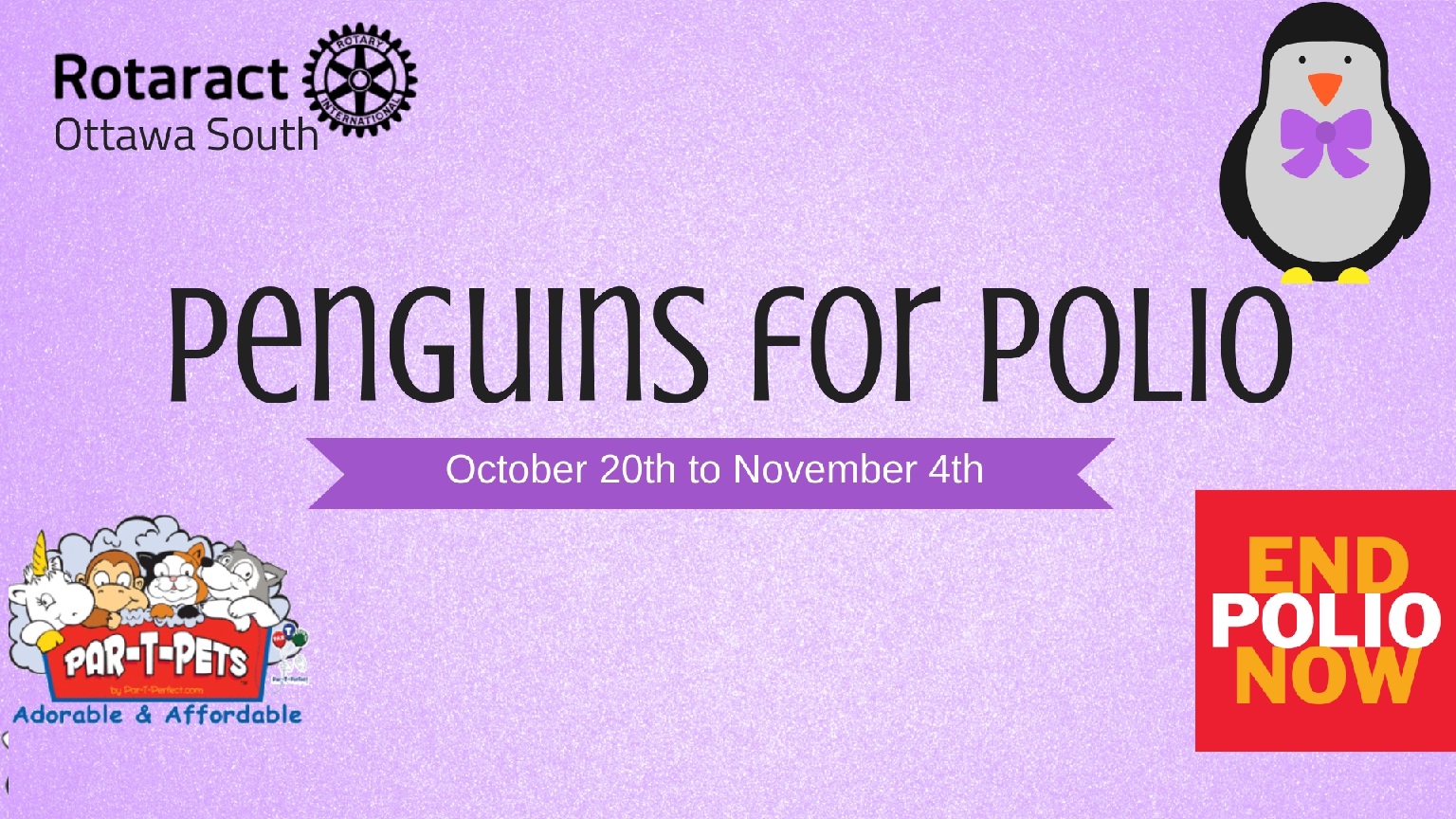 We are selling stuffed penguin toys with a purple ribbon to symbolize the efforts against polio worldwide. Each penguin costs $12 and all proceeds will go directly to End Polio Now, Rotary's global campaign. One polio vaccination currently costs roughly 75 cents Canadian to fully protect a child from polio for life. Purchasing one penguin for $12 could provide 48 vaccinations to children around the world! Our club is also going to be donating these penguins to women and children's shelters and other causes around the Ottawa community.