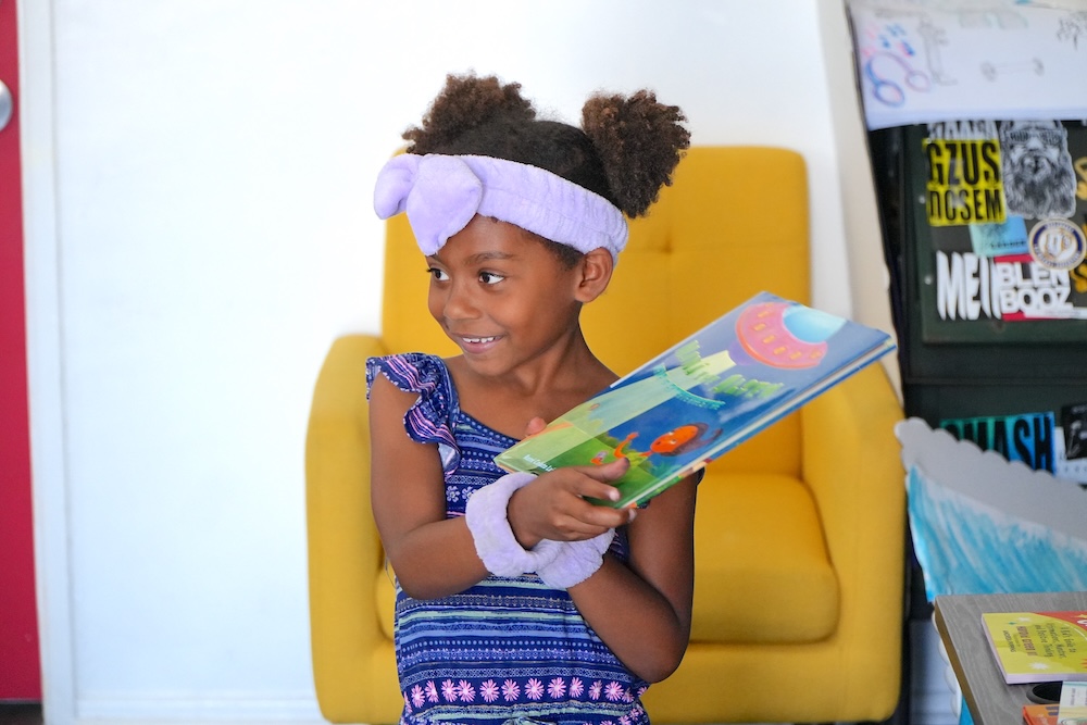 Freedom Schools Scholar proudly holds up a book.