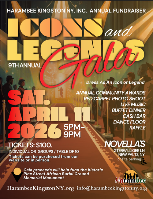 www.HarambeeKingstonNY.orgJoin us for the 9th Annual Harambee Kington NY, Inc. Gala and Community Awards. The Gala is on Saturday, April 11th, 2026 from 5pm-9pm at Novella's at 2 Terwilliger Ln. in New Platz, NY. The theme for this year is : ICON AND LEGENDS. The Gala will include the Harambee Community Awards, live music, Red Carpet Photoshoot, Buffet Dinner, Cash Bar, Dance Floor and Raffle.