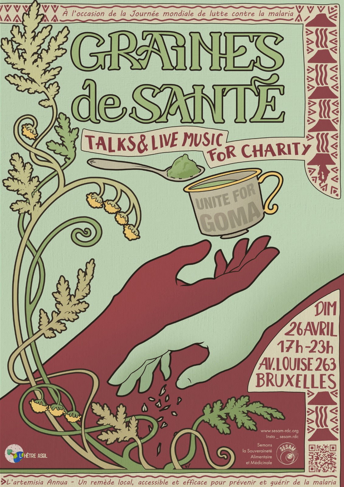 L’objectif est de récolter des fonds pour de soutenir la lutte contre le paludisme grâce à l’artemisia via la diffusion de semences, la création de pépinières et le don de matériel agricole essentiel au profit de trois associations agricoles de femmes accompagnées par SESAM ASBL.
