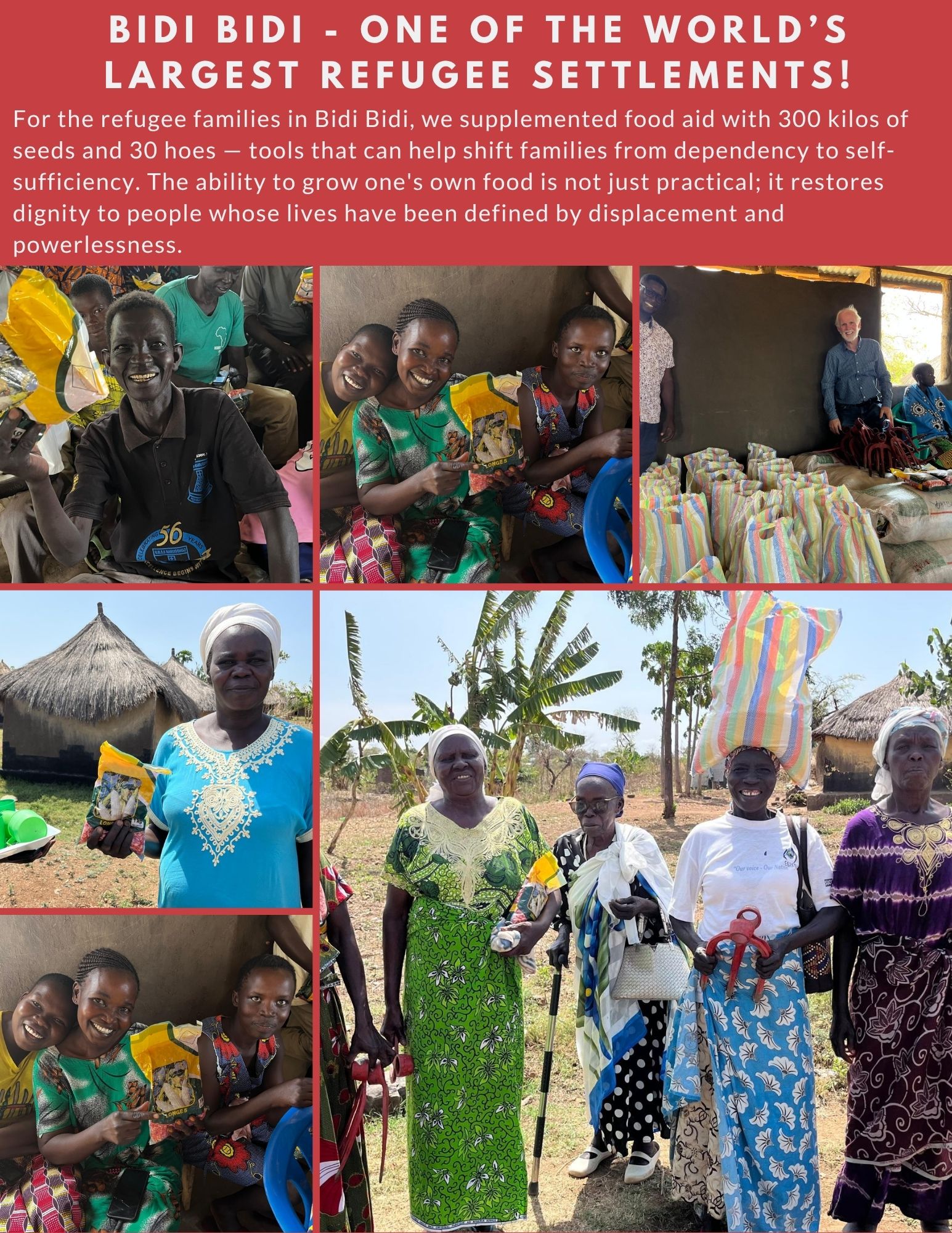 In late February we visited Bidi Bidi refugee settlement on the South Sudan/Uganda border, families depend on food aid to survive. We supplemented that aid with 300 kilos of seeds and 30 hoes — giving families the tools to grow their own food — tools that can help shift families from dependency to self-sufficiency. The ability to grow one's own food is not just practical; it restores dignity to people whose lives have been defined by displacement and powerlessness. Thank you for your help in making this possible. South Sudan — one of the poorest nations on earth — needs your help. We are returning to Bidi Bidi to bring more aid and check on the fields where the corn was planted. You can donate at: https://safehaven4refugees.org/donate Thank You!