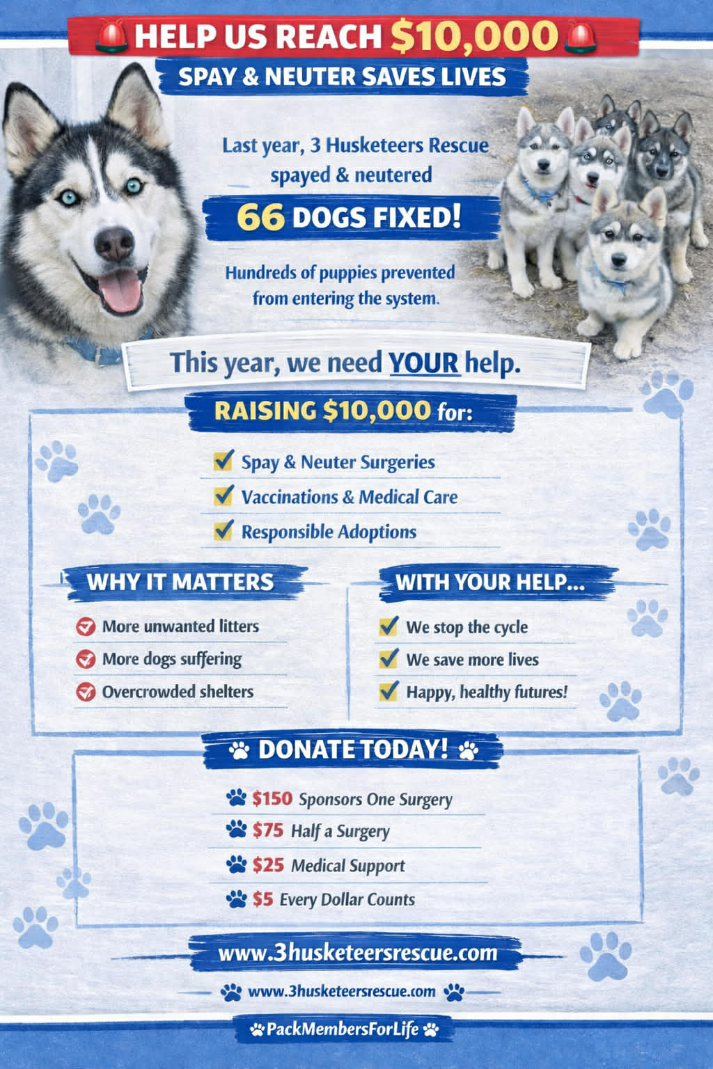 HELP 3 HUSKETEERS RAISE SPAY/NEUTER FUNDS FOR 2026