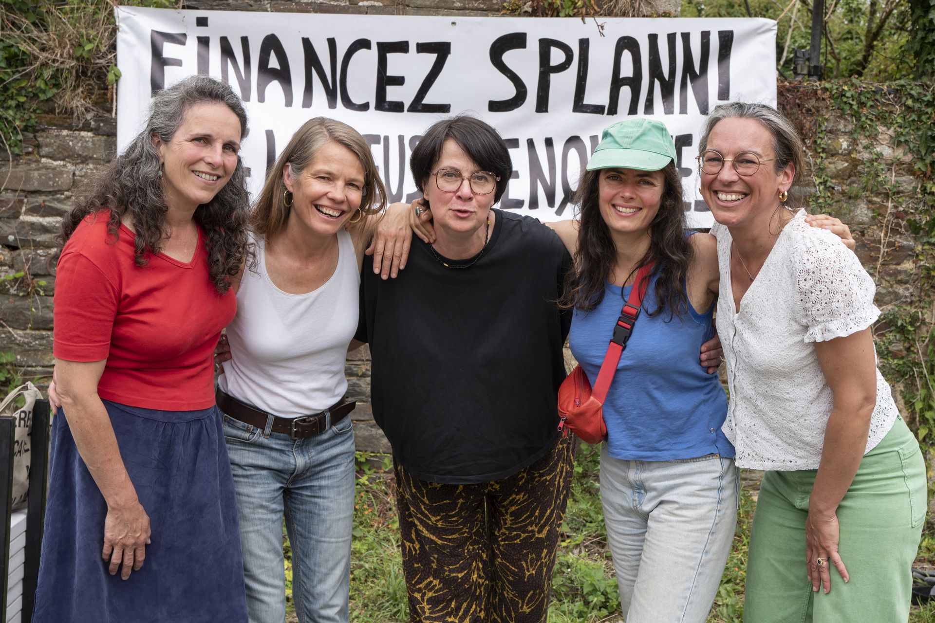 Les journalistes d'enquête Morgan Large, Catherine Le Gall, Nathalie Barbe, Inès Léraud et Marianne Kerfriden, lors de la fête des cinq ans de Splann !, organisée en juin 2025 à Châteaulin. Crédit Eric Legret