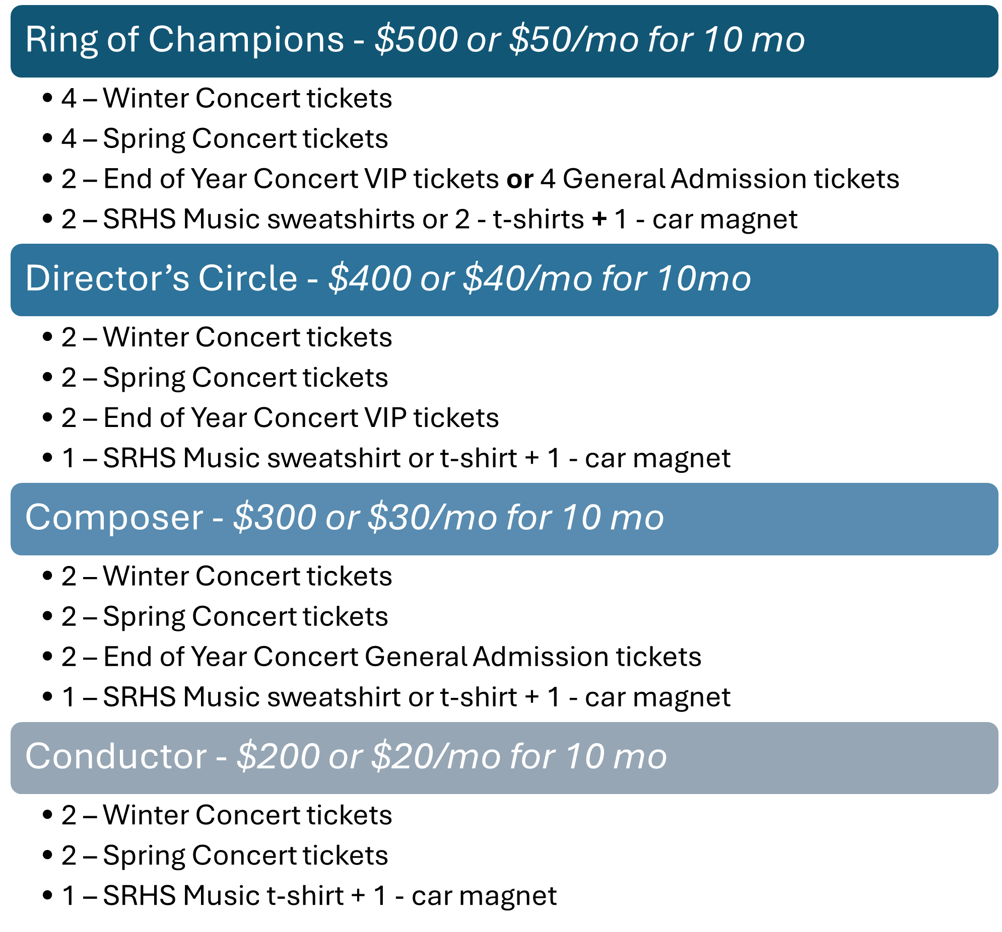 We thank you and hope to see you at one of the high-quality performances throughout the year. Check our website for dates & locations. - https://www.srhsmusic.com/