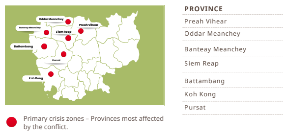 Beginning on 7 December 2025, escalating border tensions in PreahVihear and Oddar Meanchey triggered a large-scale displacement crisis. By 18 December, military operations had expanded across the northwestern provinces—including Banteay Meanchey, Oddar Meanchey, Battambang, and Siem Reap—forcing nearly 500,000 people to flee their homes in search of safety.